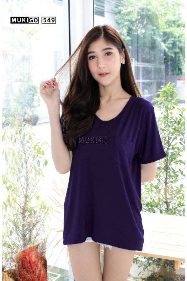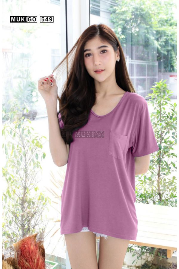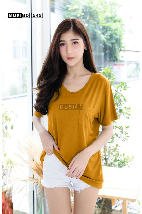 This Minimal style Tee with Short Sleeve comes in V neckline decorated with Little pocket.