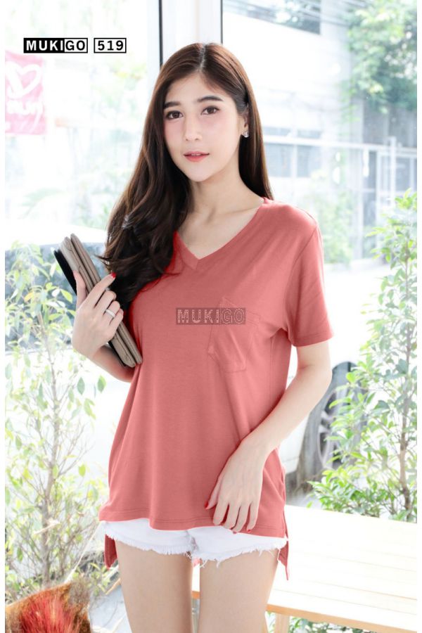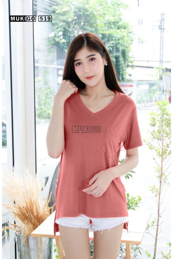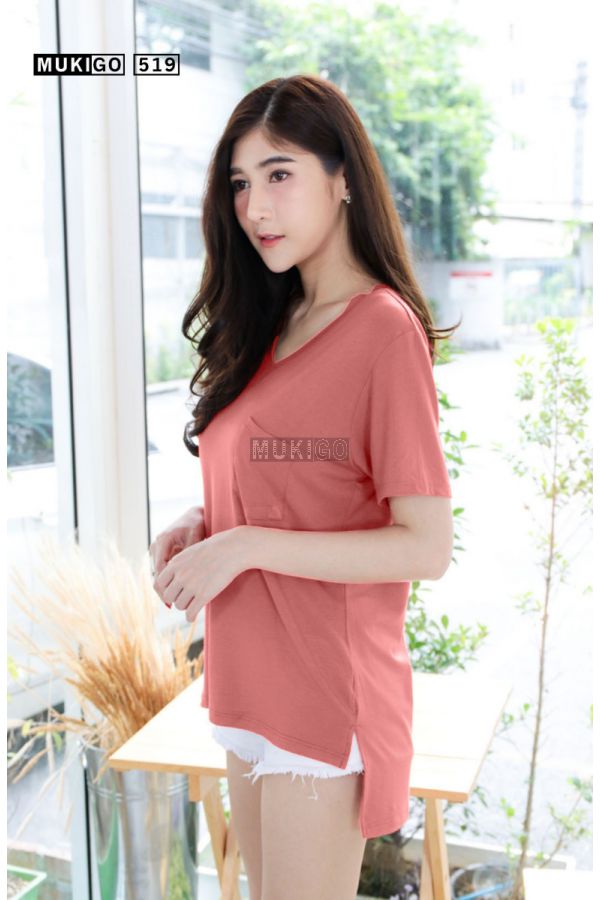 เสื้อโอเวอร์ไซส์ คอวี แต่งกระเป๋า ผ่าชายเสื้อ หน้าสั้นหลังยาว สีปูนแดงอ่อน