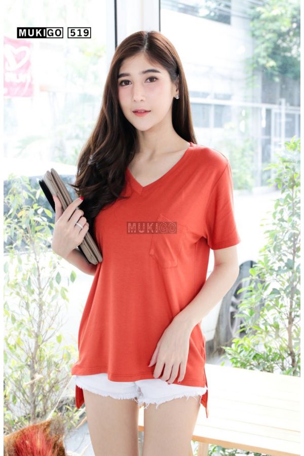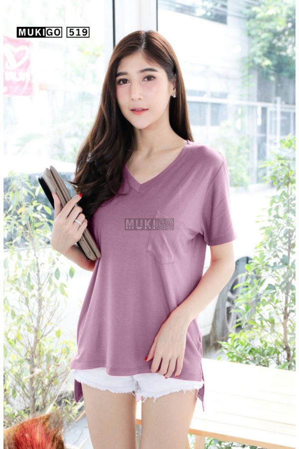 เสื้อยืดแขนสั้น คอวีกุ๊นใหญ่ แต่งดีเทลกระเป๋าเก๋ๆ ทรงตัวหลวม โอเวอร์ไซส์ ทรงสวยมากๆ