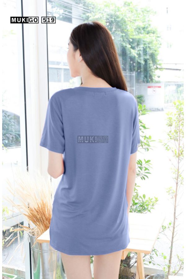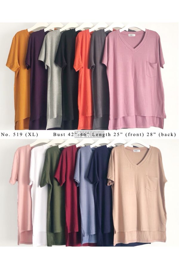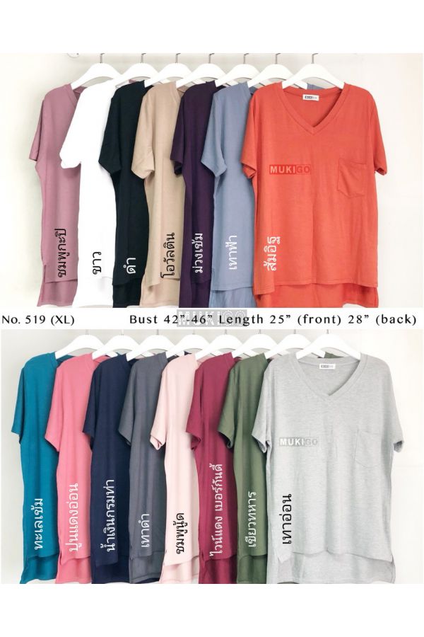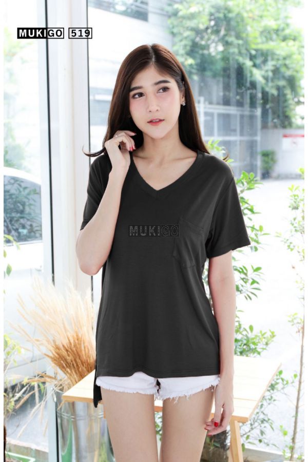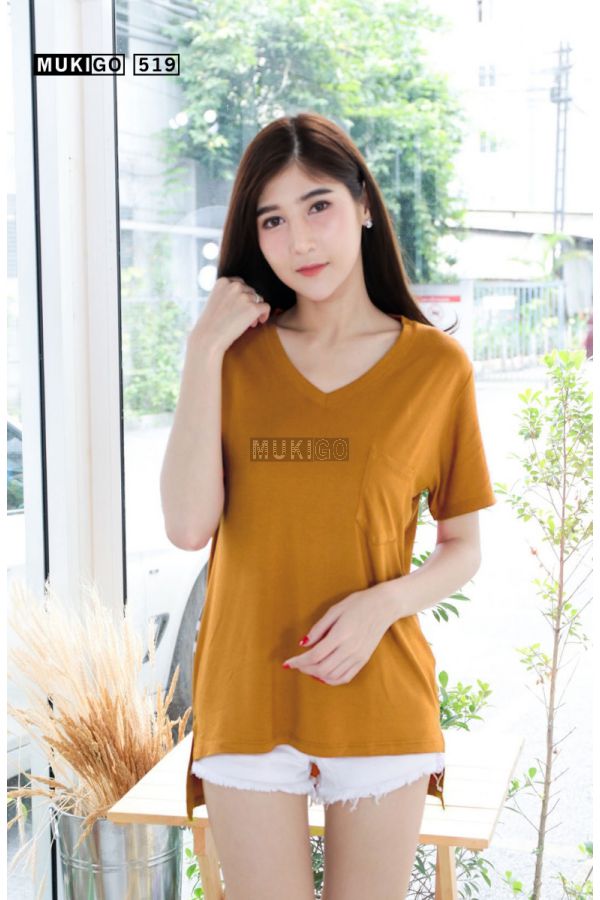 เสื้อโอเวอร์ไซส์ คอวี แต่งกระเป๋า ชายเสื้อผ่าข้าง หน้าสั้นหลังยาว - Oversized Side Slit V Tee with Pocket - No.519-XL