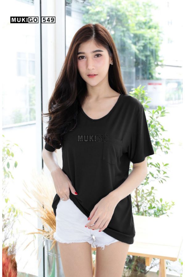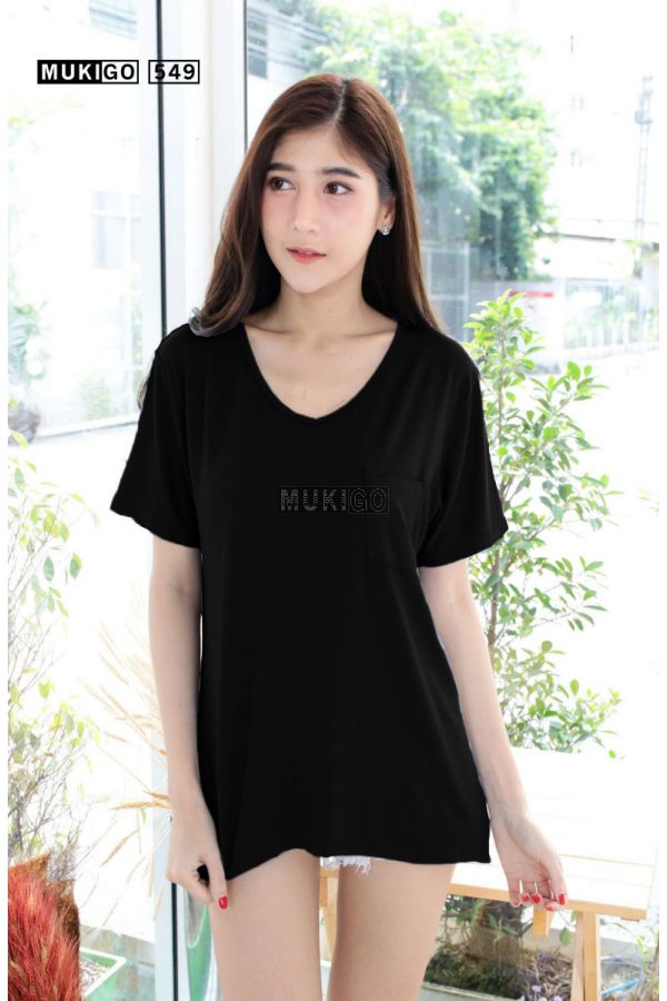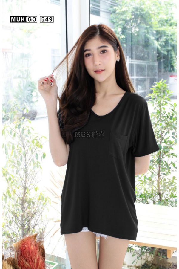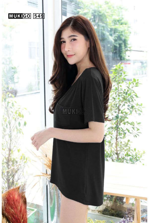 เสื้อโอเวอร์ไซส์ คอวี แต่งกระเป๋า ปลายเสื้อโค้ง สีดำ