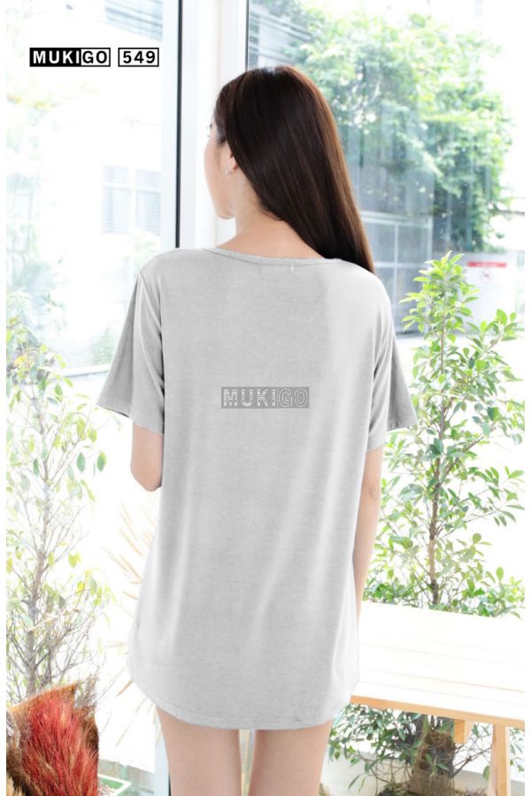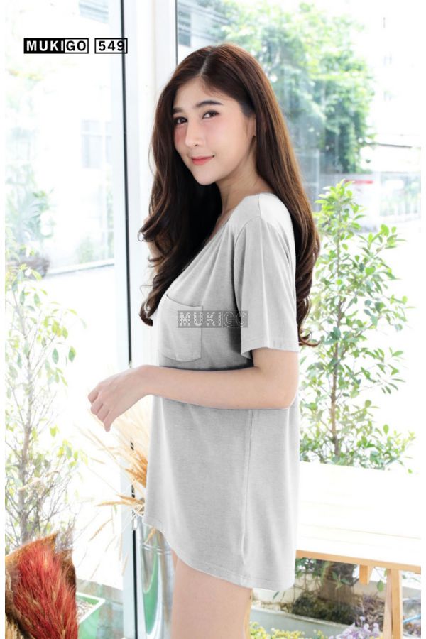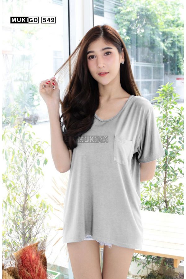 เสื้อโอเวอร์ไซส์ คอวี แต่งกระเป๋า ปลายเสื้อโค้ง สีเทายีนส์อ่อน